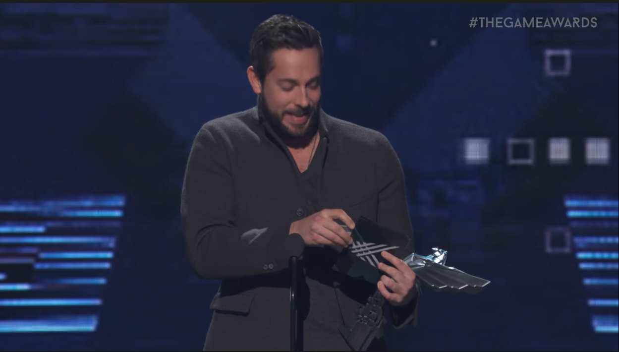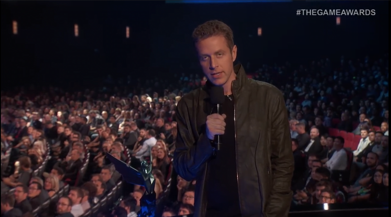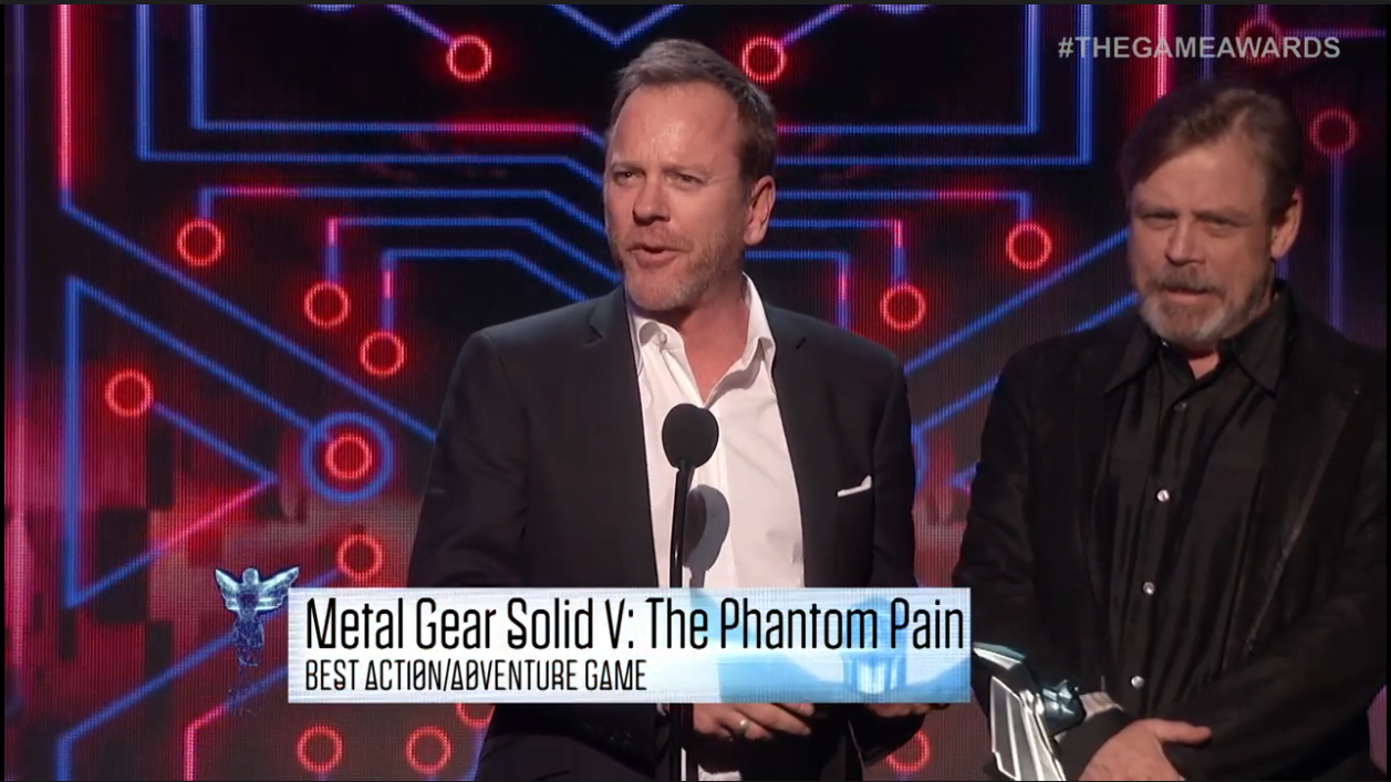 Roberts and Hamill present the Game Award for Best Action/Adventure Game, of which Metal Gear Solid V: The Phantom Pain wins. Kiefer Sutherland, the actor who performs Snake in that game, comes up to accept the award instead of lead designer Hideo Kojima. Geoff then gives a fairly somber speech saying that Konami denied Kojima the opportunity to fly down to Las Vegas to be at the awards show. At the time, Konami and Kojima had quite a falling out, and for them to hold Kojima hostage like this is pretty scummy for Konami. Though, Geoff’s speech didn’t really do the awards favors either.