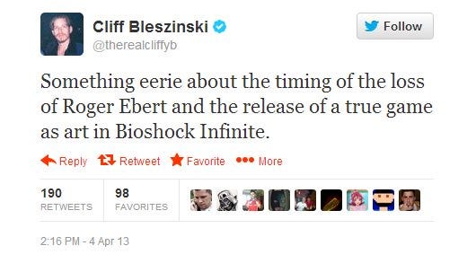 Ebert passed away in 2013 after a long-standing bout with cancer, of which game developer Cliff Bleszinski (Unreal, Gears of War, Lawbreakers, Radical Heights) made this ill-fitting tweet: