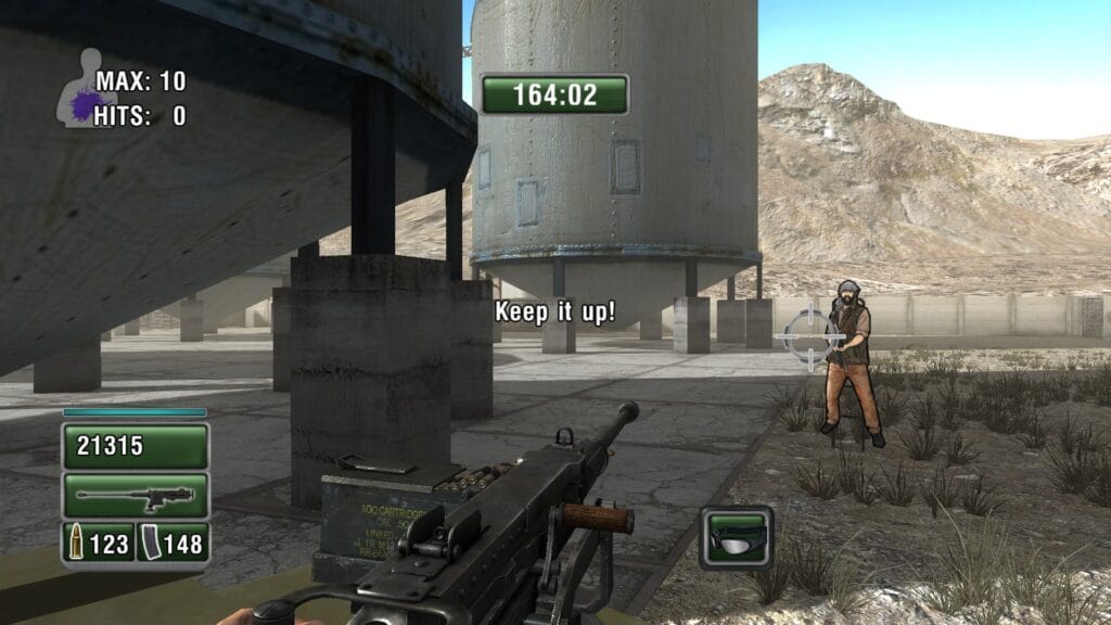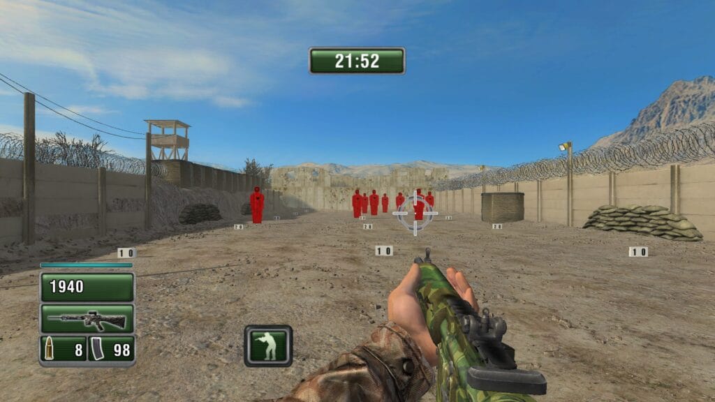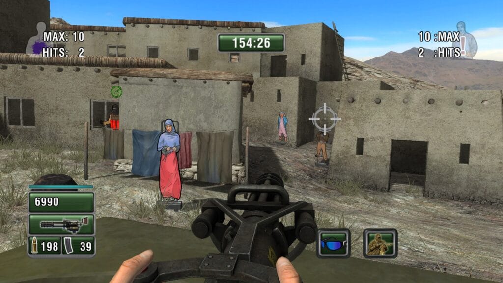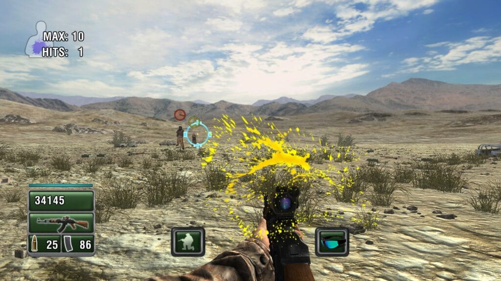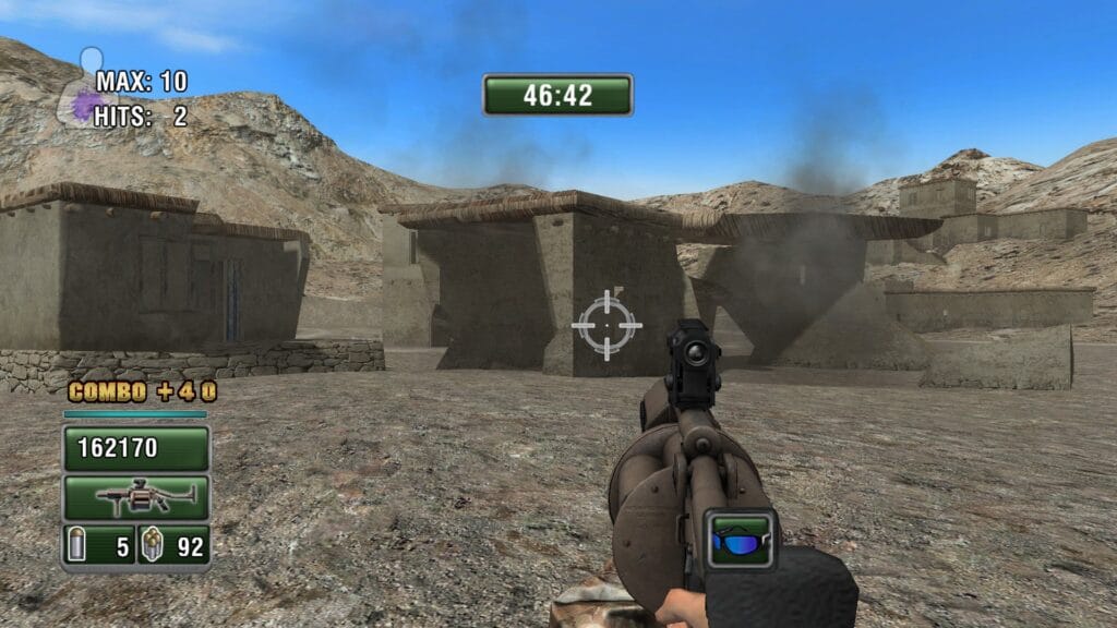 The last mission is a straightforward rail shooter area through fake desert arenas where, again, you must shoot enemy targets before they shoot you with paint, and to avoid shooting civilians. These are different models than the previous ones which looked like ordinary people, whereas these just look like generic middle eastern people. There isn’t a whole lot else to say about these, but they’re at least somewhat fun to play compared to the more stationary targets I’ve been doing for most of the game.