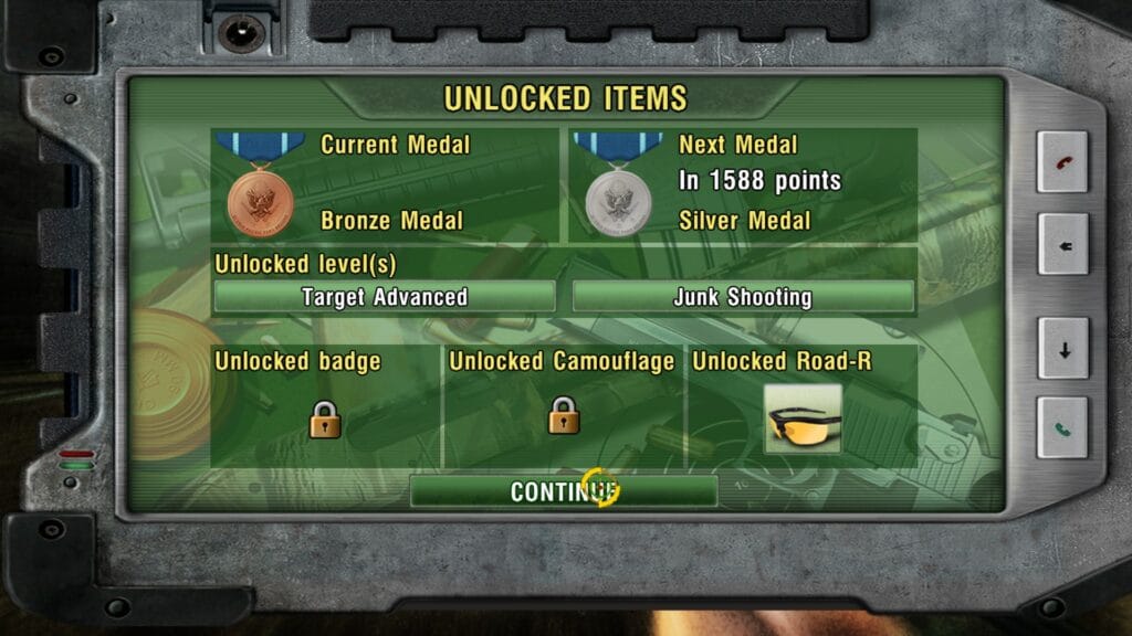 Completing missions with enough points will reward medals, of which can unlock bonus goodies like new goggles, which make special targets appear in stages for bonus points; and new camouflages to add more targets to the area for more points. While there’s only about 21 stages overall, the game encourages replay value by unlocking these rewards and subsequently replaying older missions to potentially get better medals. I did this for a few stages, but there came a point where I was okay with just passing a level without failing.
